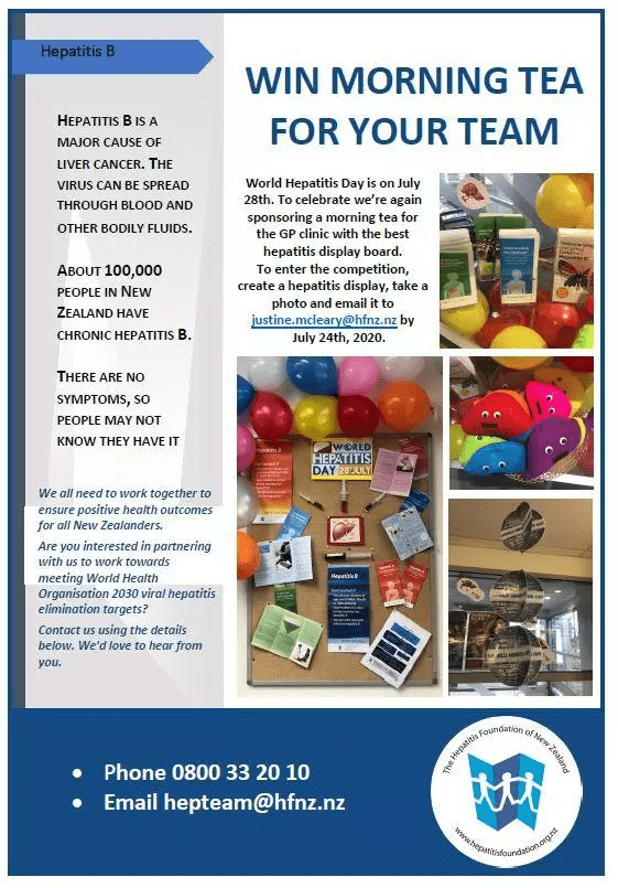 The Hepatitis Foundation of NZ is giving away a morning tea to the GP clinic with the most creative hepatitis display board. Entries are welcomed from around the country. GP clinic teams simply need to create a hepatitis display and send photos of their efforts to hepteam@hfnz.nz by July 24.