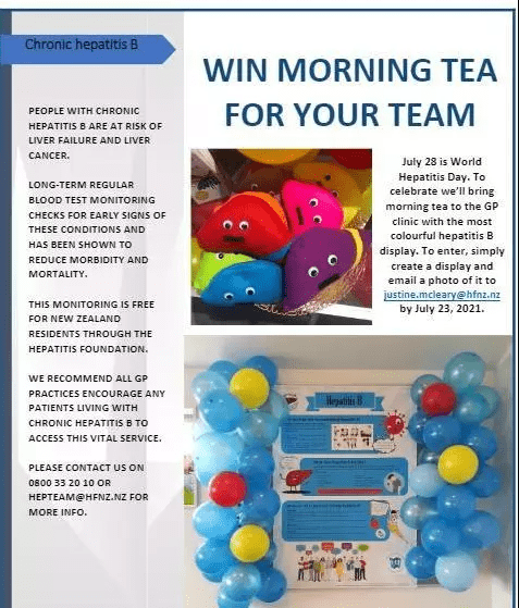 July 28 is World Hepatitis Day. To celebrate we’ll bring morning tea to the GP clinic with the most colourful hepatitis B display. To enter, simply create a display and email us photos of it by July 23, 2021.