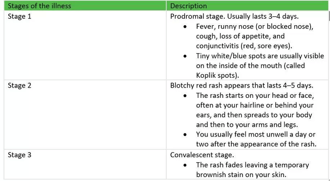 Symptoms usually begin to show about 10 to 14 days after infection and tend to appear in three stages. The infected person needs to stay away from other people. Children need to be kept home from school and adults from work, do not invite other children or visitors to your house